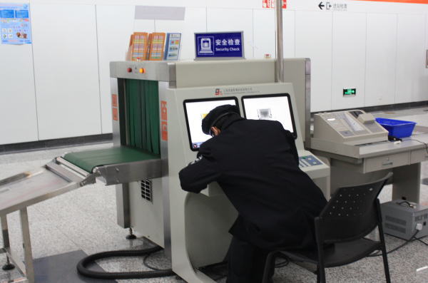 (7)万博を控え、X線による手荷物検査が行われている。