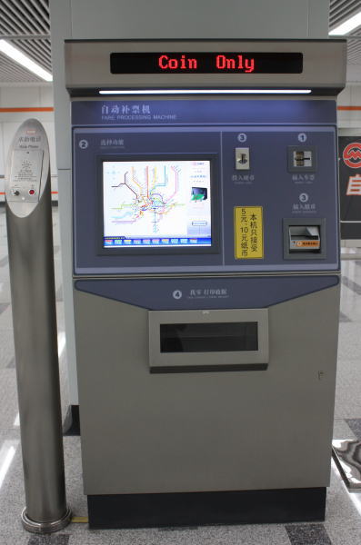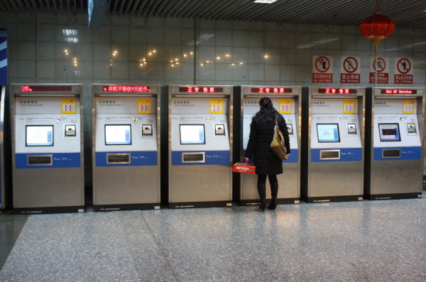 (3)自販機は名刺大のカード。料金は3元(約40円)~。最近、1日乗り放題のチケットも売りだされた。